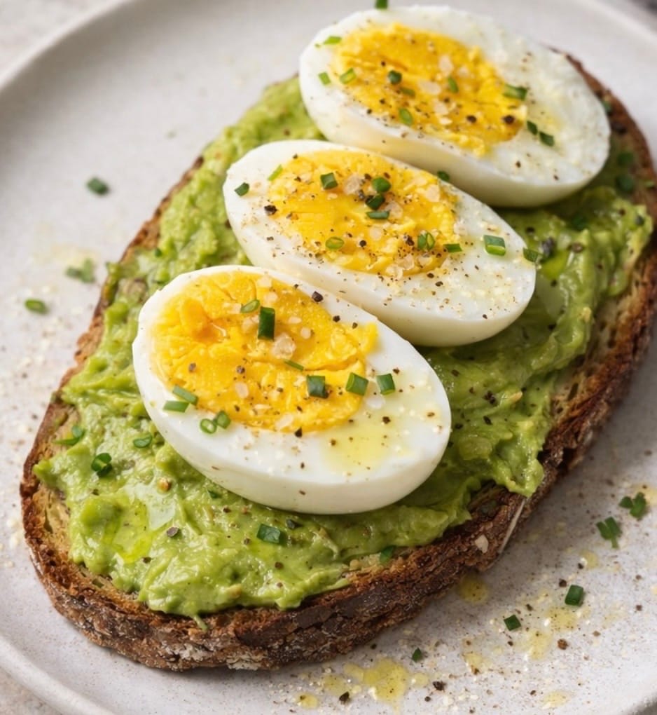 Creamy avocado spread over toasted organic seeded bread, topped with farm-fresh egg and finished with olive oil and gentle seasoning.
